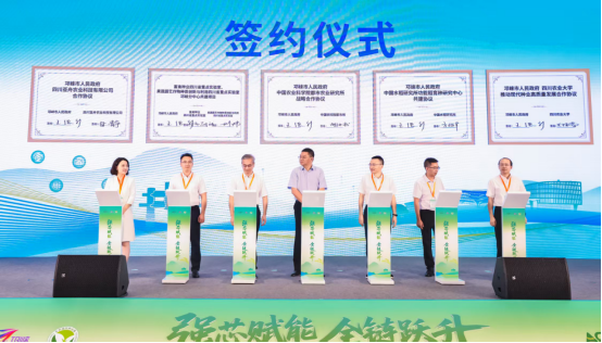 开幕式上,我校与邛崃市政府达成共推现代农业高质量发展的重要合作意向,双方拟通过深化合作,共同构建产学研用深度融合的创新体系,加速科技成果转化与产业化,提升现代种业核心竞争力,共同助力四川省打造具有全国乃至国际影响力的现代种业创新高地。本次种业展汇聚了46家种业相关企业与机构。我校从种业基础研究、国际交流合作、种业人才培养、种业服务平台、“川农牛”特色农食链建设以及2025年主推品种六个方面,系统展示了我校在种业领域的创新成果与全链条服务能力,吸引了众多种业从业者驻足交流,并就具体合作需求进行了深入探讨,寻求进一步合作的机会。