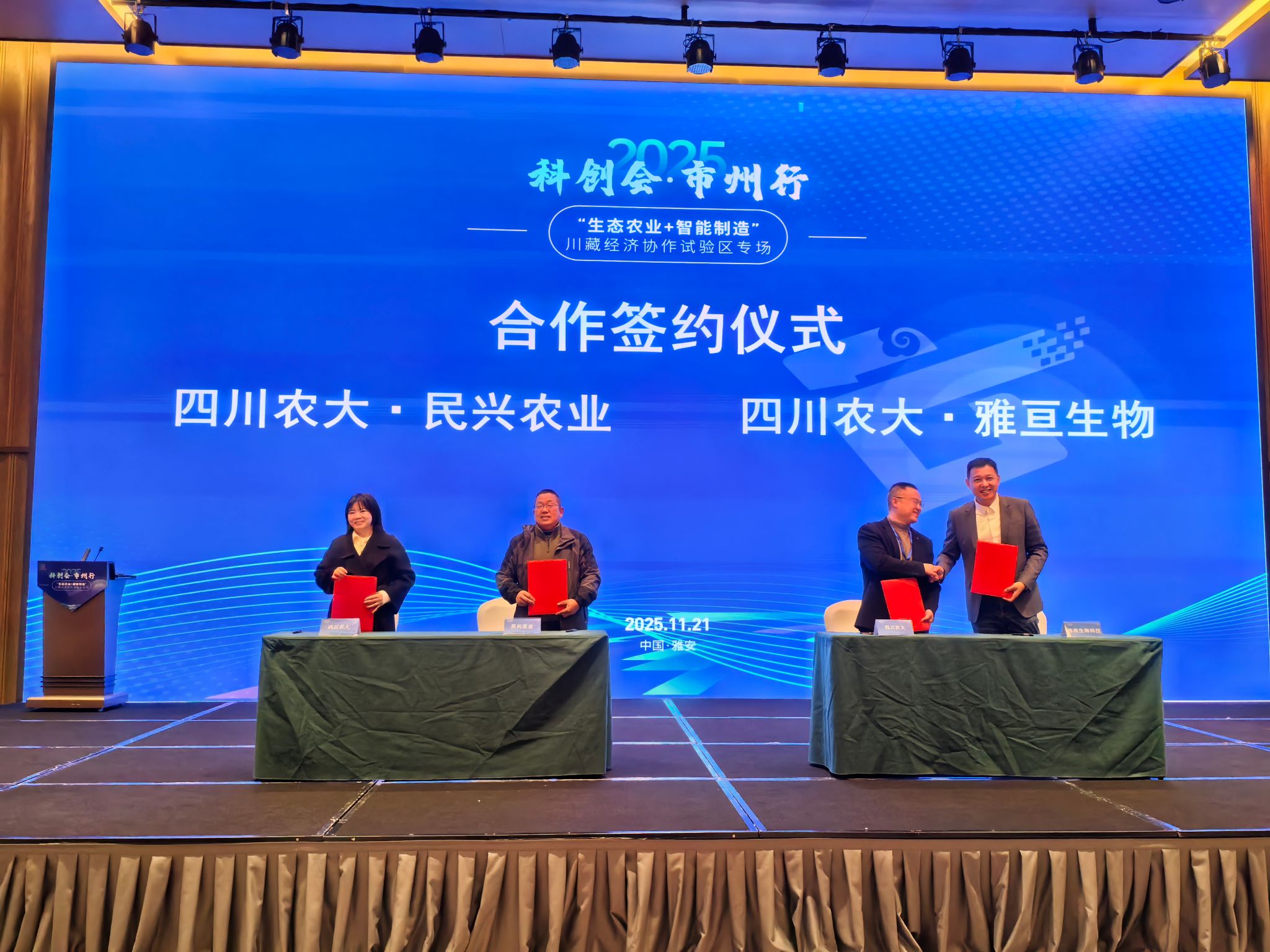 活动现场,四川恒升元健康产业有限公司、四川雅亘生物科技有限公司、雅安市民兴农业发展有限公司分别与我校签订项目合作协议。