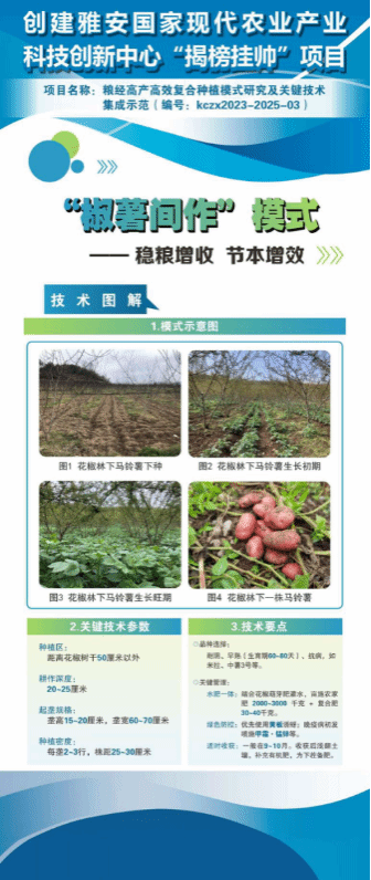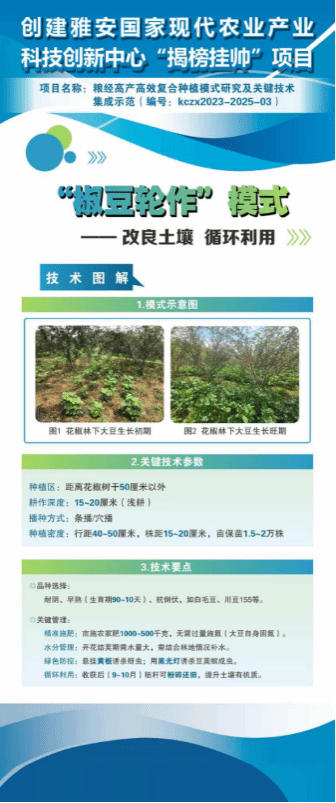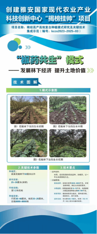 成果介绍:该成果针对花椒收入单一、土地利用率低、难以协调粮食安全与农民增收的产业难题,形成“花椒-耐荫作物”复合种植模式,花椒亩产576.9 kg(较纯林增产25.4%),亩均增收节支3000余元,《花椒园粮经复合种植节本增效关键技术》入选“四川省2026年度农业主推技术”。